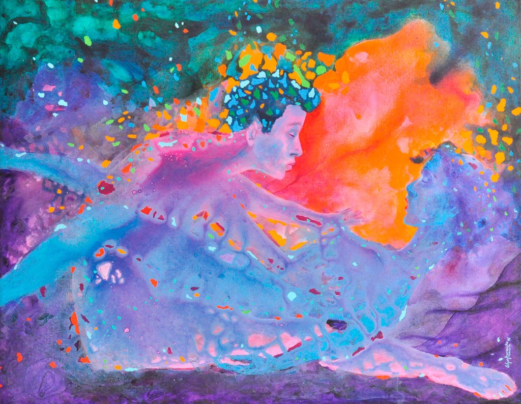 Tres años después de visitar dichos templos, los recuerdos de las esculturas comenzaron a surgir de forma espontánea de las manchas de mis cuadros abstractos, convirtiéndose en esta serie que espero disfruten. Me gustaría que vieran esta creación inspirada en la Mística Tántrica, como la posibilidad que tiene cada ser humano de encontrar en la práctica de hacer el amor «aquello que perdura».