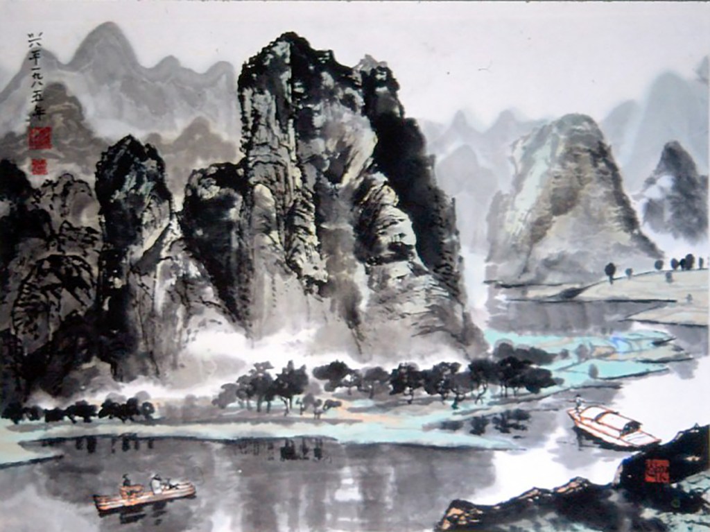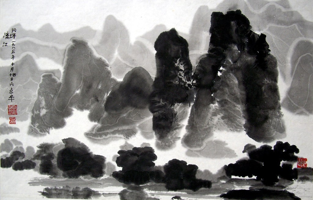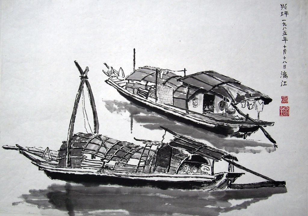 barcas en el rio Li. 48×34 cms. tinta china sobre papel. 1985 / boats on Li river. 48×34 cm. chinese ink on paper. 1985