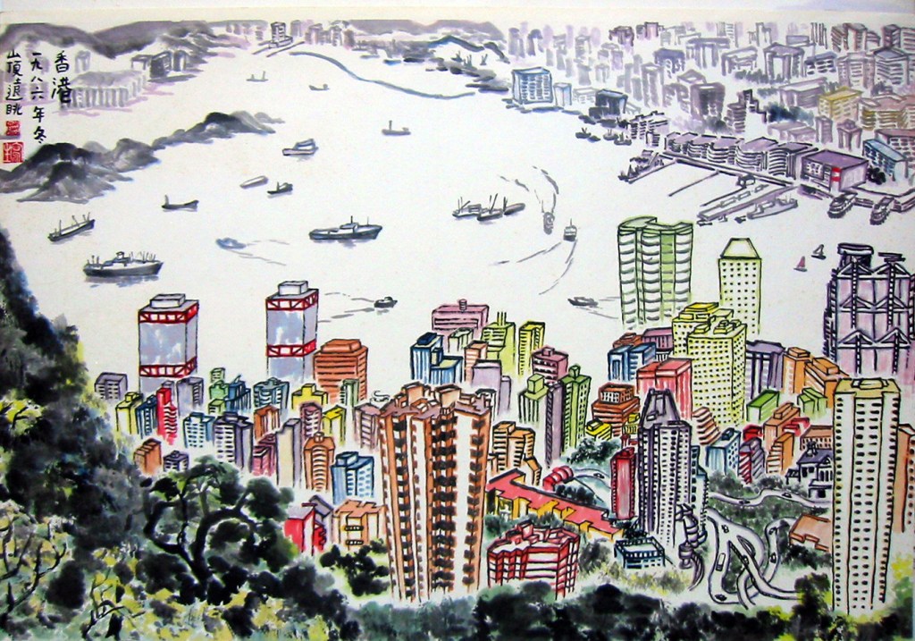 Hong Kong visto desde la cumbre. 63×45 cms. tinta china y acuarela sobre papel. 1986 / Hong Kong seen from the Peak. 63×45 cm. chinese ink and watercolor on paper. 1986