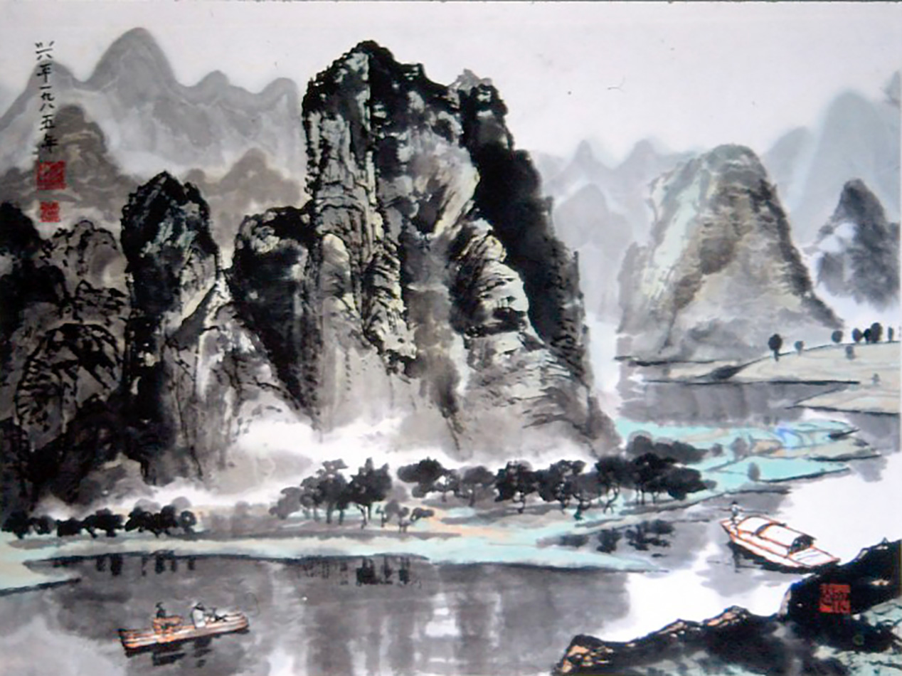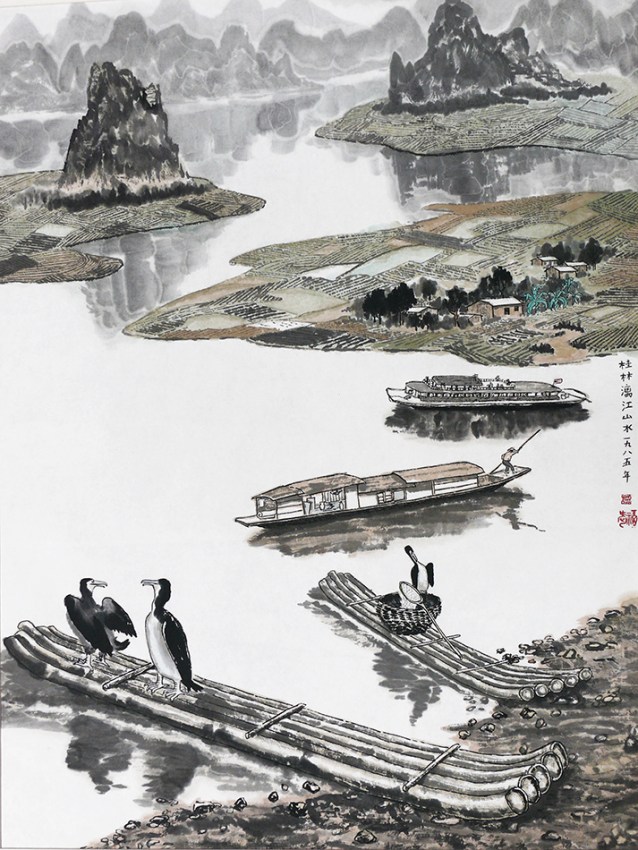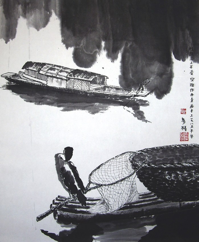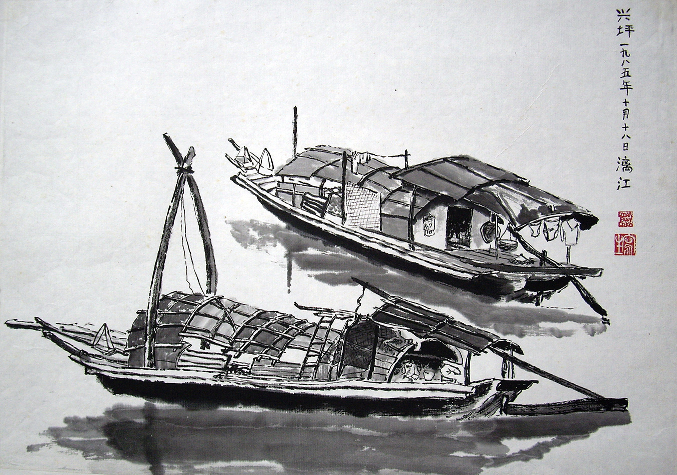 barcas en el rio Li. 48×34 cms. tinta china sobre papel. 1985