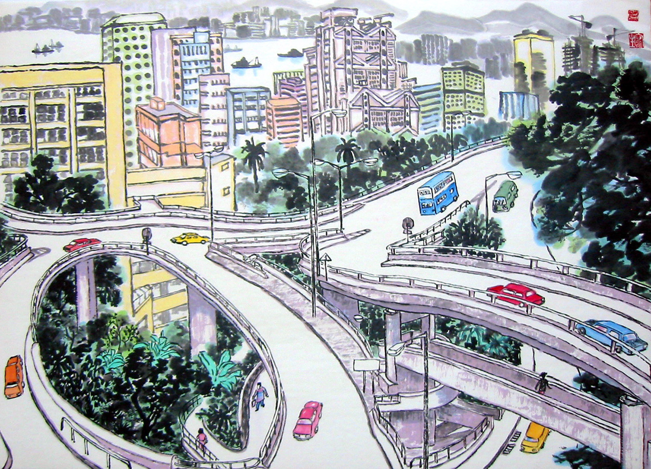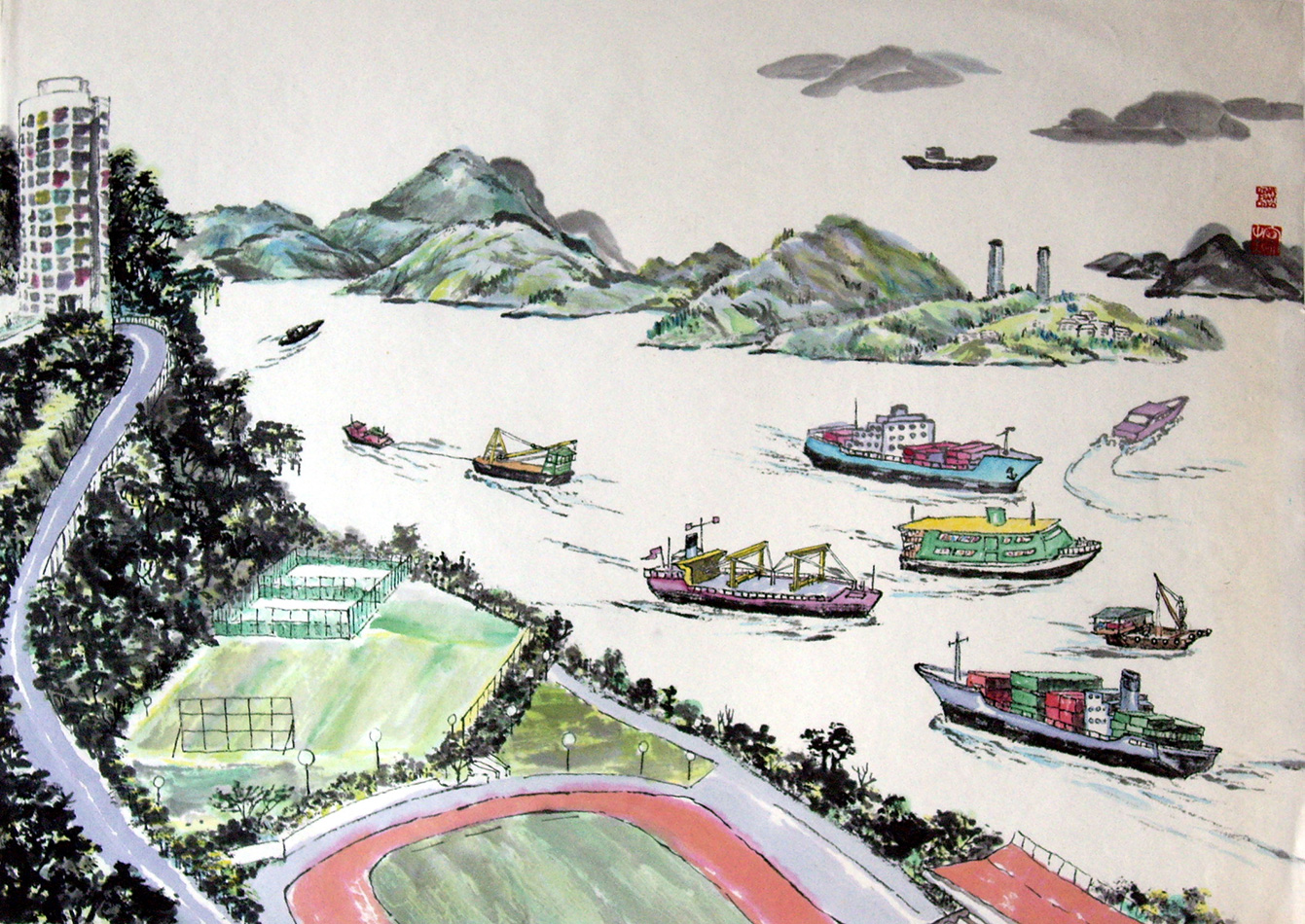 Hong Kong from the Peak. 63×45 cms. tinta china y acuarela sobre papel. 1986